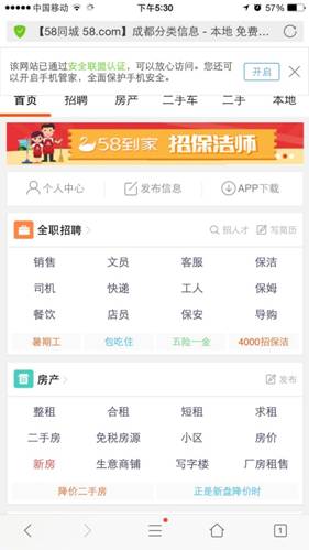 打开58同城的网站,不论是网页版还是手机客户端,都会收到这样一条提醒:该网站已通过安全联盟认证,可以放心访问。目前,网络上信息诈骗现象频发,用户在进入网站时,看到此段文字,无疑是一颗“定心丸”。