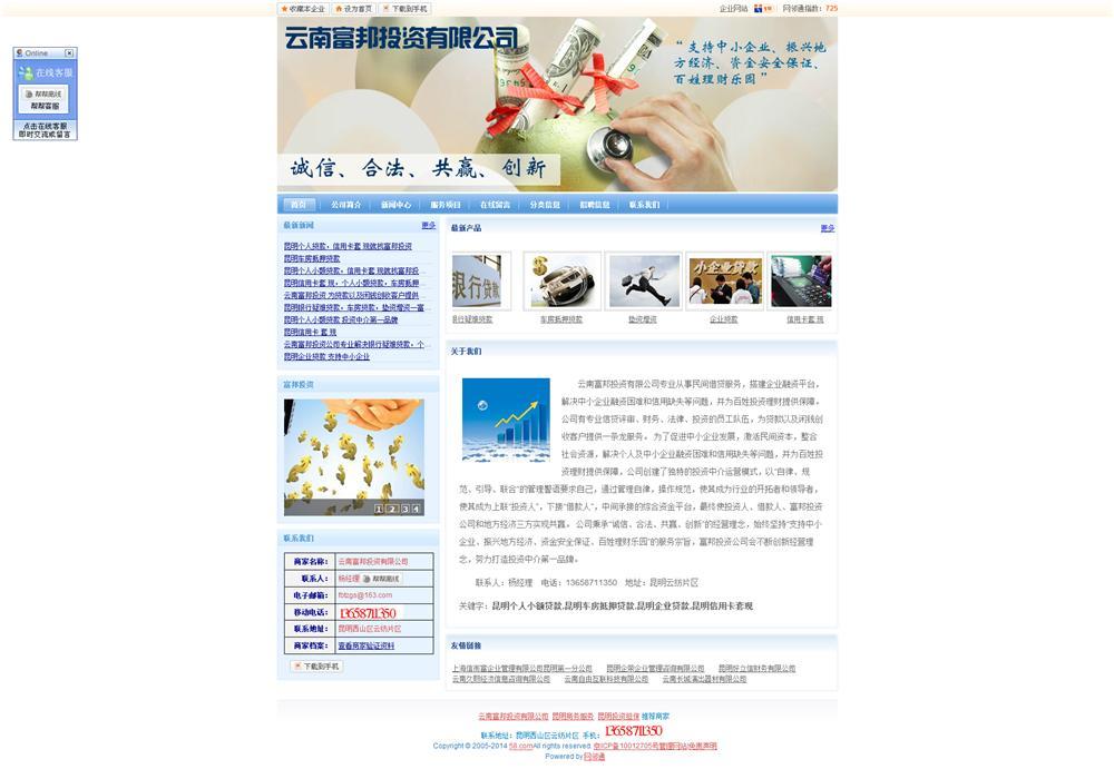 云南富邦投资有限公司专业从事民间借贷服务,搭建企业融资平台,解决中小企业融资困难和信用缺失等问题,并为百姓投资理财提供保障。公司有专业信贷评审、财务、法律、投资的员工队伍,为贷款以及闲钱创收客户提供一条龙服务。 为了促进中小企业发展,激活民间资本,整合社会资源,解决个人及中小企业融资困难和信用缺失等问题,并为百姓投资理财提供保障,公司创建了独特的投资中介运营模式,以“自律、规范、引导、联合”的管理警语要求自己,通过管理自律,操作规范,使其成为行业的开拓者和领导者,使其成为上联“投资人”,下接“借款人”,中间承接的综合资金平台,最终使投资人、借款人、富邦投资公司和地方经济三方实现共赢。 公司秉承“诚信、合法、共赢、创新”的经营理念,始终坚持“支持中小企业、振兴地方经济、资金安全保证、百姓理财乐园”的服务宗旨,富邦投资公司会不断创新经营理念,努力打造投资中介第一品牌。