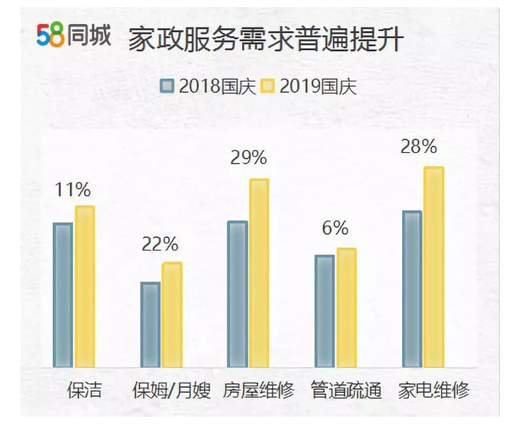 日前,58同城发布《国庆家政消费报告》,对搬家、保洁清洗、保姆月嫂、房屋维修、管道疏通、家电维修等服务数据进行分析。报告显示,国庆期间消费者对保洁、保姆月嫂、房屋维修的市场需求普遍增加,分别同比增长11%、22%、29%,反映出家政服务让消费者的假期游玩、休息更安心。