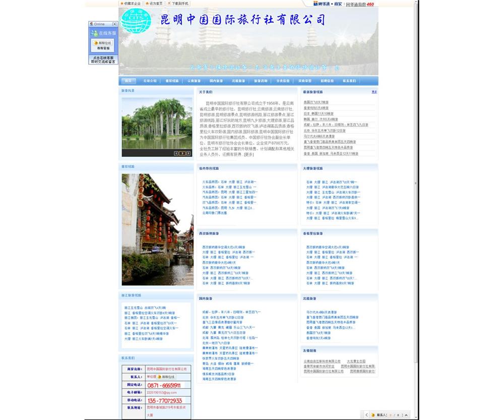 昆明中国国际旅行社有限公司成立于1956年,是云南省成立最早的旅行社,昆明旅行社,云南旅游,云南旅行社,昆明旅游,昆明旅游景点,昆明旅游线路,丽江旅游景点,丽江旅游线路,丽江好玩的地方,昆明九乡旅游,大理旅游,丽江品质游,香格里拉旅游,西双版纳双飞游,泸沽湖高品质游,香格里拉火车双卧游,国内旅游,国际旅游,昆明中国国际旅行社为中国国际旅行社集团成员、中国旅行社协会副会长单位、昆明市旅行社协会会长单位。企业资产8700万元,全社员工除了经验丰富的外联销售、计划调配和其他相关业务人员外,还拥有获得国家旅游局资格认证的英、法、德、日、泰、越、意、粤、语、普通话等语种的优秀翻译导游。昆明中国国际旅行社多年来一直荣获:全国国际旅行社百强和云南省10强国际社第一名。