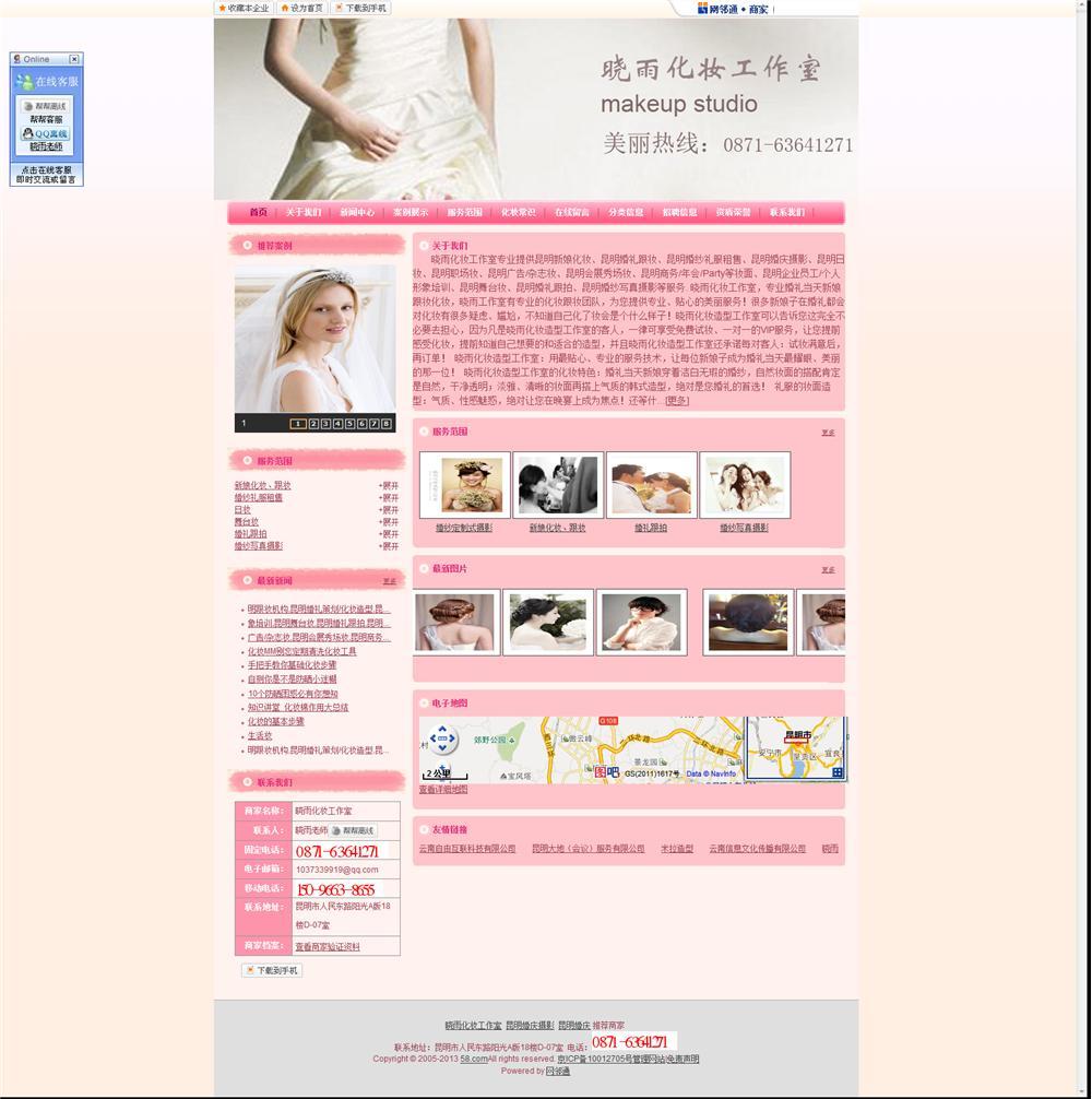 晓雨化妆工作室专业提供昆明新娘化妆、昆明婚礼跟妆、昆明婚纱礼服租售、昆明婚庆摄影、昆明日妆、昆明职场妆、昆明广告/杂志妆、昆明会展秀场妆、昆明商务/年会/Party等妆面、昆明企业员工/个人形象培训、昆明舞台妆、昆明婚礼跟拍、昆明婚纱写真摄影等服务.