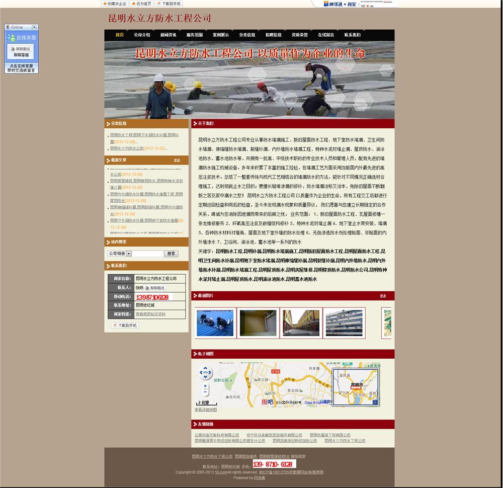 昆明水立方防水工程公司专业从事防水堵漏施工、新旧屋面防水工程、地下室防水堵漏、卫生间防水堵漏、伸缩缝防水堵漏、裂缝补漏、内外墙防水堵漏工程、特种水泥封堵止漏、屋顶防水、游泳池防水、蓄水池防水等,并拥有一批高、中级技术职称的专业技术人员和管理人员,配有先进的堵漏防水施工机械设备。多年来积累了丰富的施工经验,在堵漏工艺方面采用当前国内外最先进的高压注浆技术。