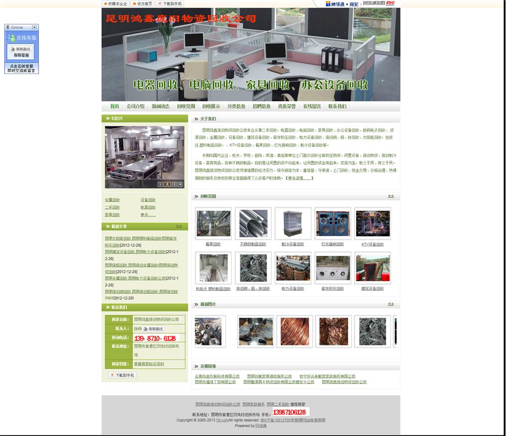 昆明鸿鑫废旧物资回收公司专业从事二手回收,电器回收、电脑回收、家具回收、办公设备回收、数码电子回收、 资源回收、金属回收、设备回收、建筑设备回收、库存积压回收、电力设备回收、废旧铜、铝、铁回收、太阳能回收、包拆迁、塑料制品回收、KTV设备回收、餐具回收、灯光音响回收、制冷设备回收等,长期向国内企业、机关、学校、医院、宾馆、酒店等单位上门高价回收仓库积压物资、闲置设备、废旧物资、废旧制冷设备、客房用品、各种不锈钢制品。