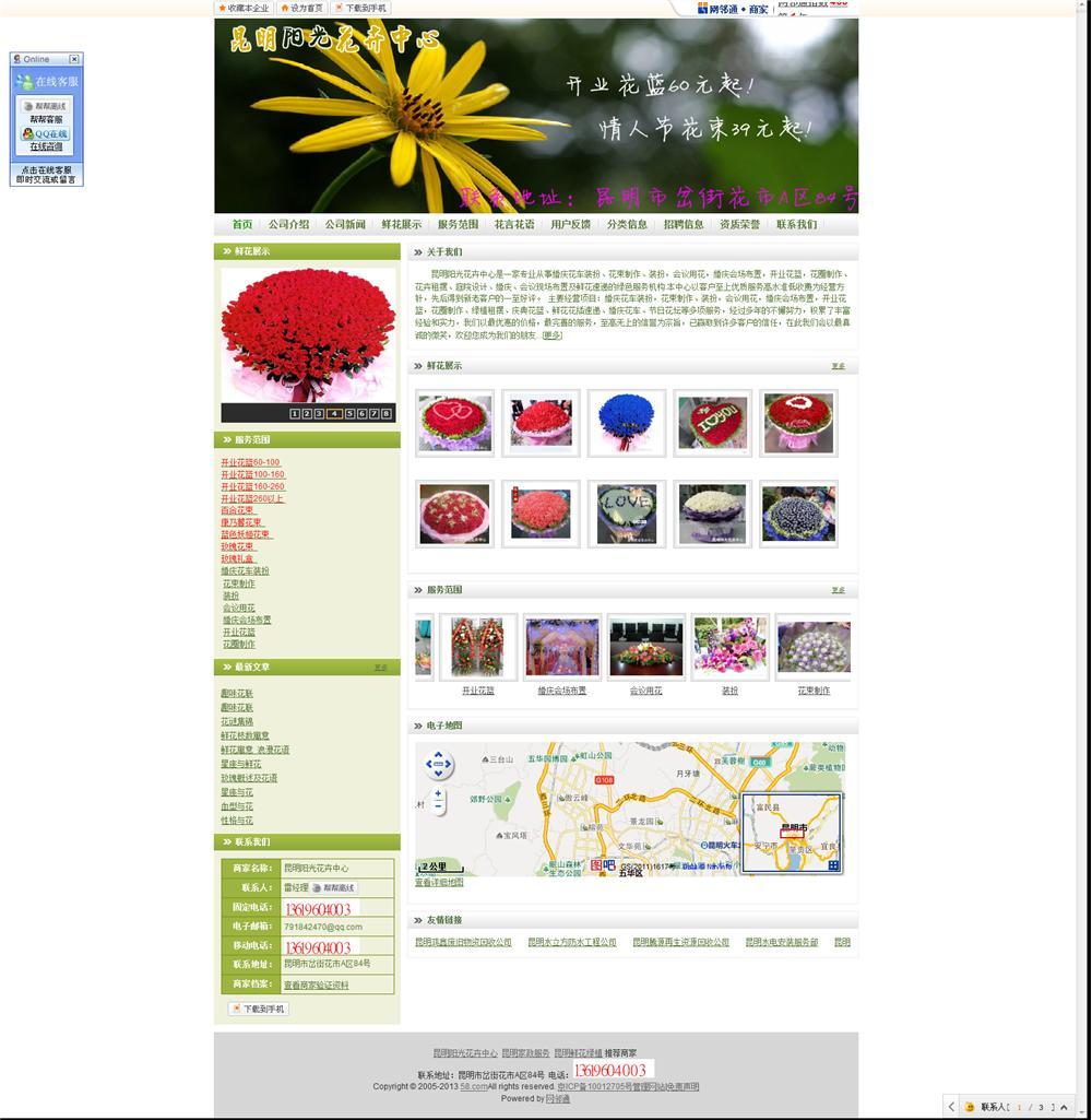 昆明阳光花卉中心是一家专业从事婚庆花车装扮、花束制作、装扮,会议用花,婚庆会场布置,开业花篮,花圈制作、花卉租摆、庭院设计、婚庆、会议现场布置及鲜花速递的绿色服务机构.本中心以客户至上优质服务高水准低收费为经营方针,先后得到新老客户的一至好评。