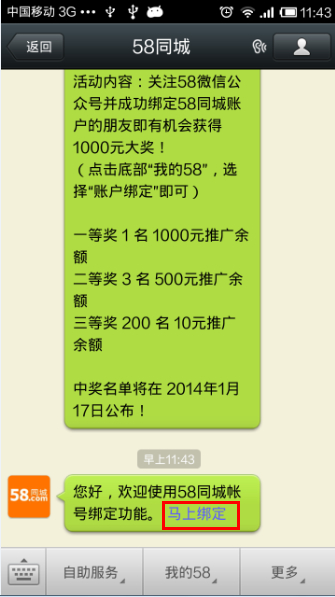 您只要绑定58官方微信,即可参与抽奖:赠送推广余额。